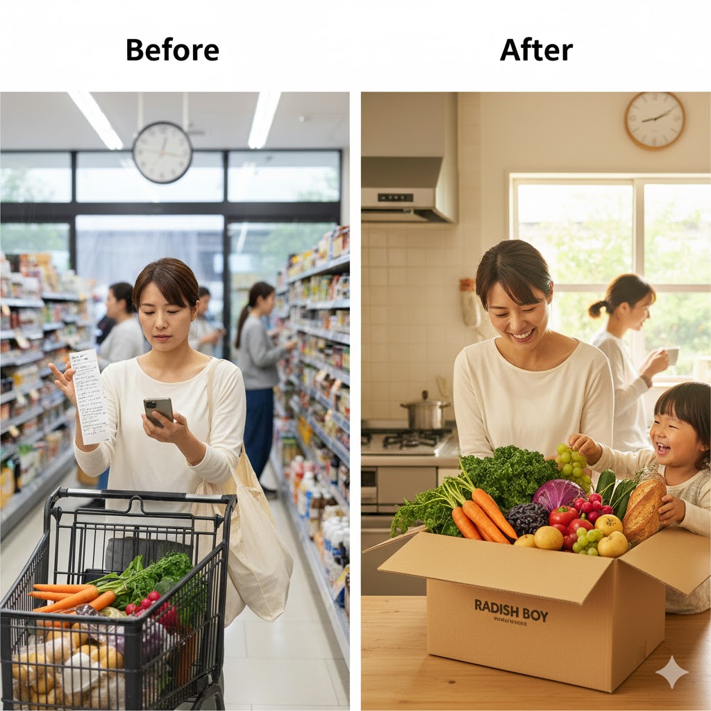 自宅まで新鮮な食材が配送されるため、重い荷物を運ぶ必要がなく、忙しい日々の中で買い物に費やす時間を大幅に削減できます。特に天候が悪い日や体調が優れない日の大きな助けとなります。