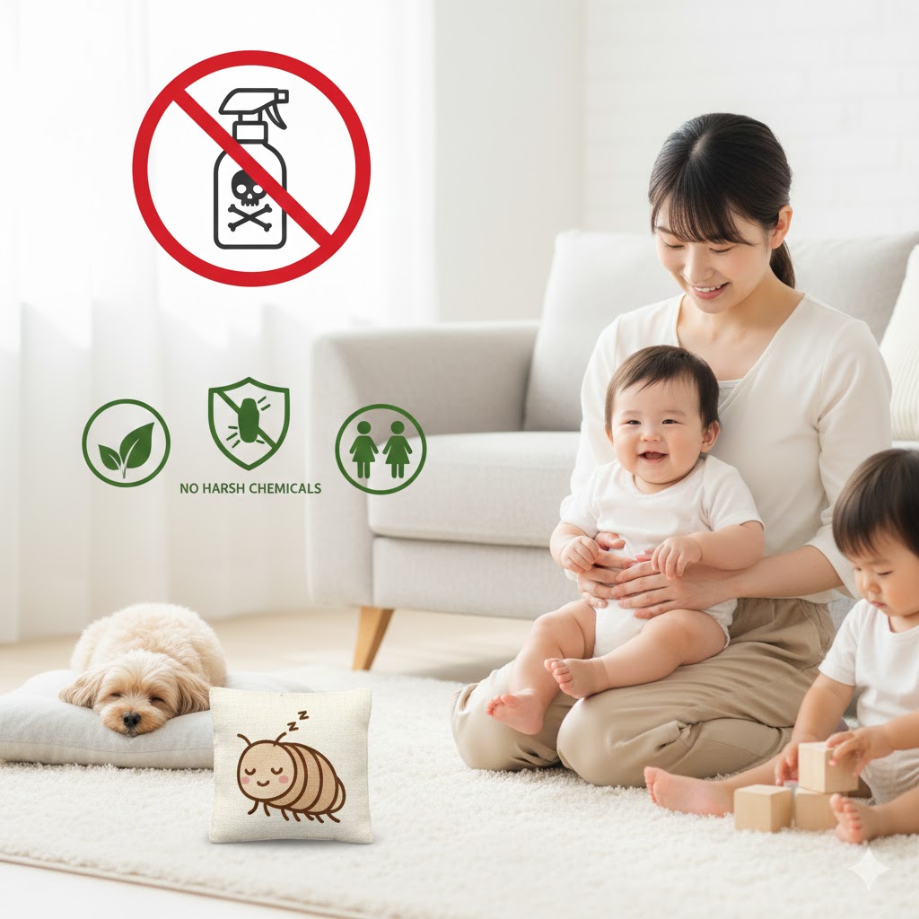 A. いいえ。殺虫成分は一切使用していません。食品添加物を利用した誘引剤と物理的な粘着力でダニを捕獲するため、小さなお子様やペットがいるご家庭でも安心してお使いいただけます。
